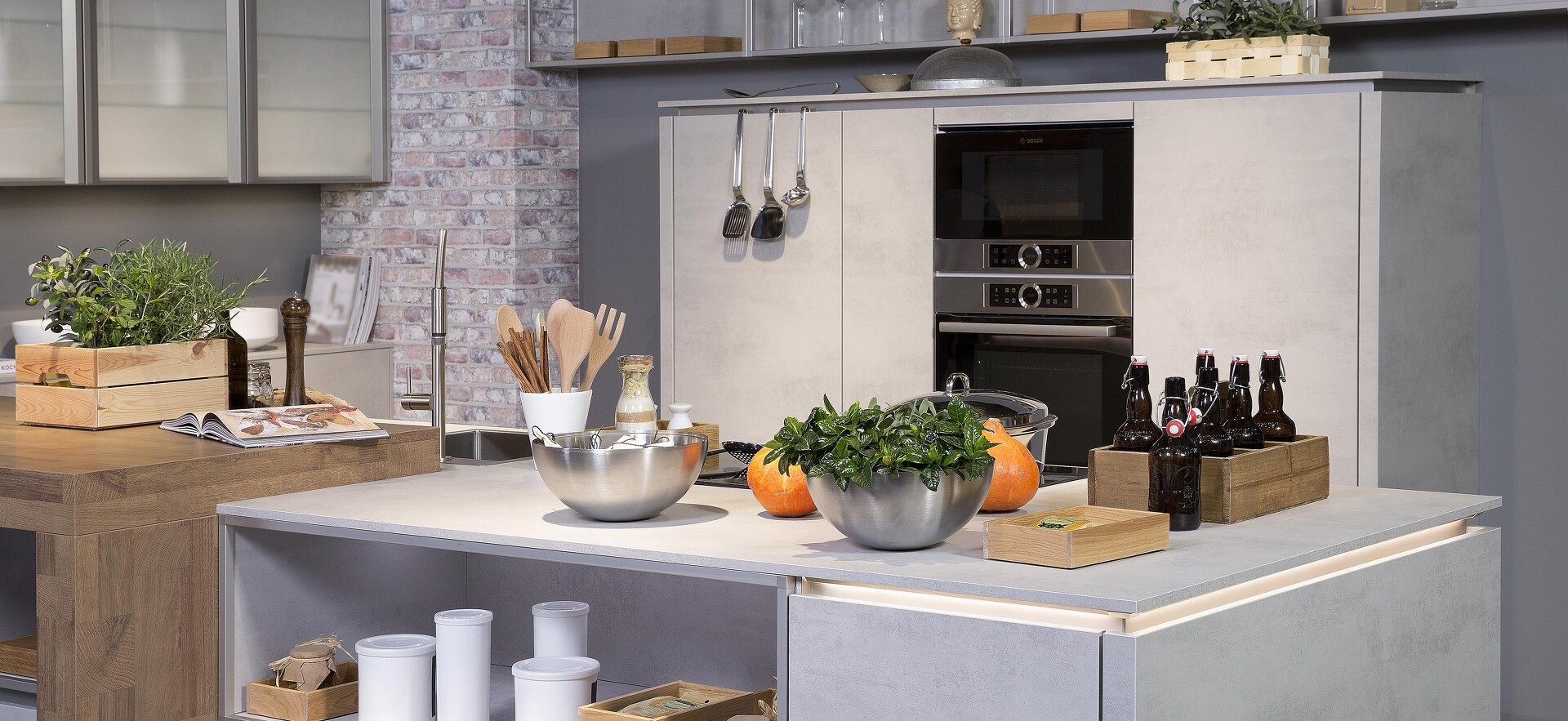Wie gut Steinoptikfronten und Holz zusammenpassen zeigt dieses Beispiel einer Inselküche mit Fronten, die Beton nachempfunden sind, in Kombination mit einem hohen Thekentisch in Balkeneiche. Matt glänzende Edelstahlrahmen an den Vitrinenhängeschränken und den offenen Regalbereichen runden diese Zusammenstellung gekonnt ab. Kühles Grau und Silber werden durch den warmen Holzton aufgefangen, bevor der Gesamteindruck zu nüchtern und unbehaglich wirkt. Dass Industriechic aber das Aushängeschild dieser Küche bleibt, wird an der Tapete in realitätsnaher Ziegelmaueroptik sichtbar, die einen weichen Farbkontrast mit den silbernen Metallregalen eingeht.